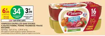 Actuellement en offre chez Intermarché Hyper : Materne Compotes coupelles sans sucres ajoutés pomme, pomme framboise fraise ✅ Valable du 8-04 au 19-04.
