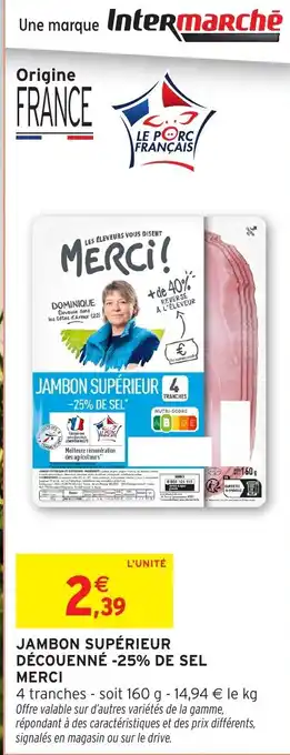 Offre MERCI Jambon supérieur découenné -25% de sel chez Intermarché Hyper