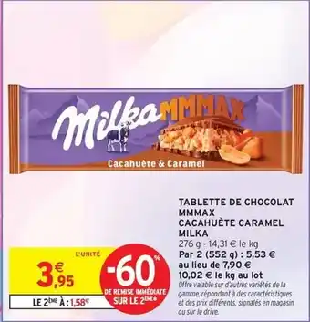 Actuellement en offre chez Intermarché Hyper : Milka - tablette de chocolat mmmax cacahuète caramel ✅ Valable du 3-02 au 15-02.