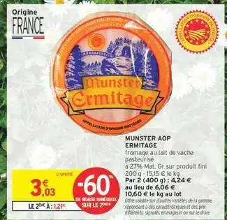 Actuellement en offre chez Intermarché Hyper : Munster AOP Ermitage ✅ Valable du 3-02 au 15-02.