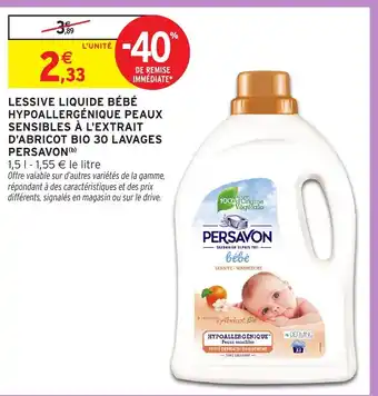 Actuellement en offre chez Intermarché Hyper : Persavon Lessive liquide bébé hypoallergénique peaux sensibles à l'extrait d'abricot bio 30 lavages ✅ Valable du 8-04 au 19-04.