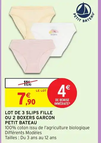 Actuellement en offre chez Intermarché Hyper : Petit Bateau Lot de 3 slips fille ou 2 boxers garcon ✅ Valable du 8-04 au 19-04.