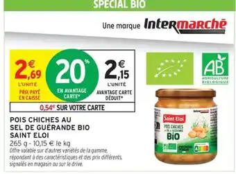 Actuellement en offre chez Intermarché Hyper : POIS CHICHES AU SEL DE GUÉRANDE BIO SAINT ELOI ✅ Valable du 10-03 au 22-03.