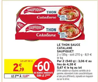 SAUPIQUET Le thon sauce catalane bénéficie actuellement d'une réduction chez Intermarché Hyper. Vous trouverez ici toutes les infos utiles sur les prix, la durée de validité et les conditions de l’offre. Pensez à consulter aussi d'autres offres et promotions similaires pour SAUPIQUET Le thon sauce catalane afin d’acheter toujours au bon prix. La promo SAUPIQUET Le thon sauce catalane est valable du 03-03-2026 au 15-03-2026. Offre terminée ? Pas de souci. D'autres offres sur ces produits sont peut-être déjà disponibles. Vous pouvez suivre cette catégorie de produits pour rester informé en cas de nouvelle promotion SAUPIQUET Le thon sauce catalane chez Intermarché Hyper. En comparant les offres, vous êtes sûr d’acheter au prix le plus bas possible.Questions fréquemment posées au sujet de SAUPIQUET Le thon sauce catalane