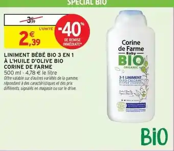 En plus de l'offre Signal - liniment bébé bio 3 en 1 à l'huile d'olive bio, Intermarché Hyper propose une large gamme de produits. Consultez le Catalogue Intermarché Hyper hebdomadaire pour découvrir les meilleures offres et promotions. En plus de Signal - liniment bébé bio 3 en 1 à l'huile d'olive bio, il y a aussi : CORINE DE FARME Liniment bébé bio 3 en 1 à l'huile d'olive bio, Huile d'olive Bio & Cadum bebe gel nettoyant corps et cheveux à l'huile d'amande douce bio.