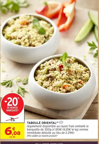 En plus de l'offre Taboulé oriental, Intermarché Hyper propose une large gamme de produits. Consultez le Catalogue Intermarché Hyper hebdomadaire pour découvrir les meilleures offres et promotions. En plus de Taboulé oriental, il y a aussi : Taboulé Oriental, Taboulé oriental & MIX BUFFET Taboulé oriental.