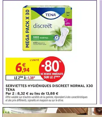 Actuellement en offre chez Intermarché Hyper : TENA Serviettes hygiéniques discreet normal x30 ✅ Valable du 17-03 au 29-03.