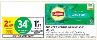 Actuellement en offre chez Intermarché Hyper : THÉ VERT MENTHE ORIGINE ASIE LIPTON ✅ Valable du 10-03 au 22-03.