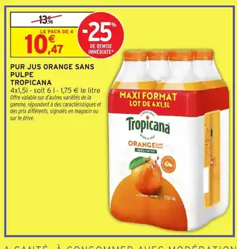 Offre TROPICANA Pur jus orange sans pulpe chez Intermarché Hyper