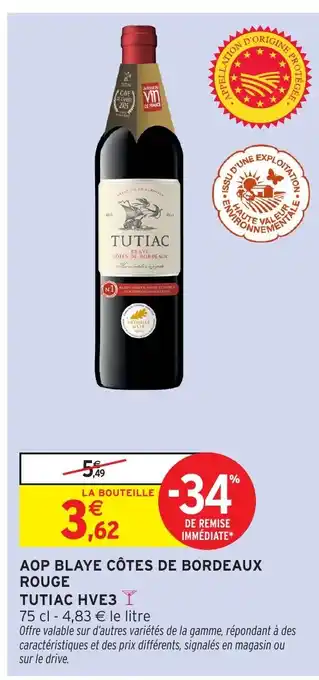 Offre TUTIAC HVE3 Aop blaye côtes de bordeaux rouge chez Intermarché Hyper