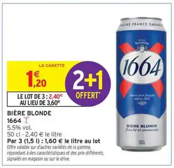En plus de l'offre 1664, Intermarché propose une large gamme de produits. Consultez le Catalogue Intermarché hebdomadaire pour découvrir les meilleures offres et promotions. En plus de 1664, il y a aussi : 1664 Bière, 1664 Bière blonde & 1664 Bière blonde.