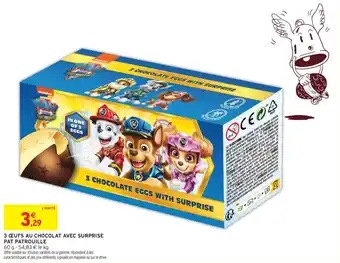 Actuellement en offre chez Intermarché : 3 œufs au chocolat avec surprise pat patrouille ✅ Valable du 14-04 au 19-04.