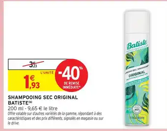 Le prix de l'offre Batiste shampooing sec original se trouve également en haut de la page, ainsi que la date à laquelle l'offre est disponible. Vous pouvez également vérifier les prix dans le Catalogue Intermarché Drive actuel ou sur le site Internet de Intermarché. Les offres vous permettent d'acheter les produits Intermarché au prix le plus bas.