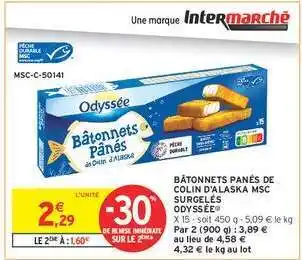Actuellement en offre chez Intermarché : BÂTONNETS PANÉS DE COLIN D'ALASKA MSC SURGELÉS ODYSSÉE ✅ Valable du 3-02 au 15-02.