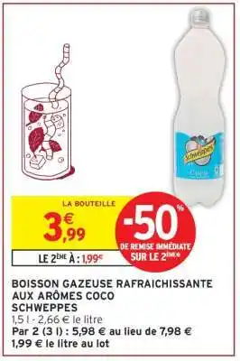 Actuellement en offre chez Intermarché : BOISSON GAZEUSE RAFRAICHISSANTE AUX ARÔMES COCO SCHWEPPES ✅ Valable du 10-03 au 22-03.