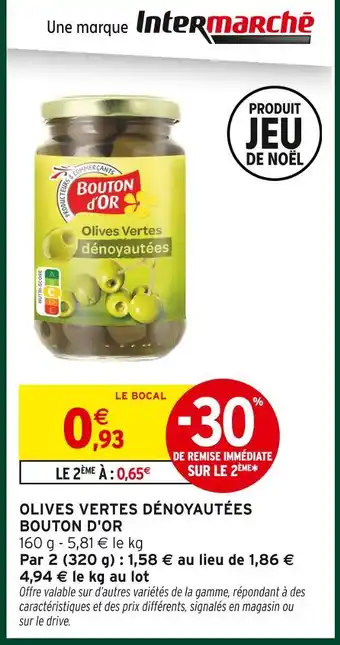 Actuellement en offre chez Intermarché : Bouton d'or olives vertes dénoyautées ✅ Valable du 23-12 au 31-12.