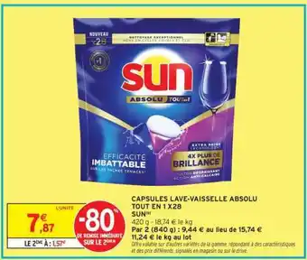 Actuellement en offre chez Intermarché : CAPSULES LAVE-VAISSELLE ABSOLU TOUT EN 1 X28 ✅ Valable du 20-01 au 1-02.