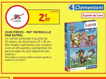 Le prix de l'offre CLEMENTONI 2x20 pièces -pat' patrouille paw patrol se trouve également en haut de la page, ainsi que la date à laquelle l'offre est disponible. Vous pouvez également vérifier les prix dans le Catalogue Intermarché actuel ou sur le site Internet de Intermarché. Les offres vous permettent d'acheter les produits Intermarché au prix le plus bas.