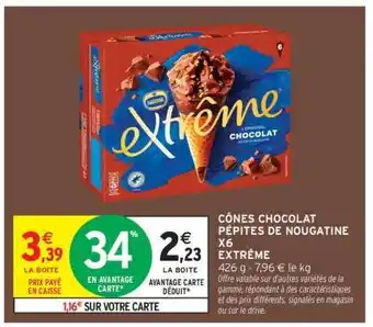 Actuellement en offre chez Intermarché : CÔNES CHOCOLAT PÉPITES DE NOUGATINE X6 EXTRÊME ✅ Valable du 27-01 au 8-02.