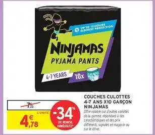 Actuellement en offre chez Intermarché : COUCHES CULOTTES 4-7 ANS X10 GARÇON NINJAMAS ✅ Valable du 6-01 au 18-01.