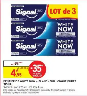 En plus de l'offre DENTIFRICE WHITE NOW + BLANCHEUR LONGUE DURÉE SIGNAL, Intermarché propose une large gamme de produits. Consultez le Catalogue Intermarché hebdomadaire pour découvrir les meilleures offres et promotions. En plus de DENTIFRICE WHITE NOW + BLANCHEUR LONGUE DURÉE SIGNAL, il y a aussi : Signal dentifrice white now 3en1, Signal - dentifrice white now 3en1 & Dentifrice signal white now 3en1.
