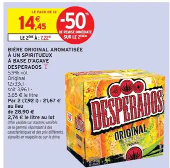 Actuellement en offre chez Intermarché : Desperados bière original aromatisée à un spiritueux à base d'agave ✅ Valable du 8-04 au 19-04.