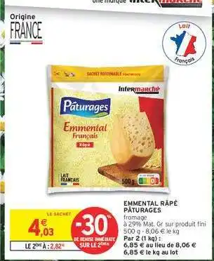 Actuellement en offre chez Intermarché : EMMENTAL RÂPÉ PÂTURAGES ✅ Valable du 3-02 au 15-02.