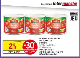 Actuellement, Fiorini double concentré de tomates est en promotion chez Intermarché. Toutes les informations utiles comme le prix, les conditions et la durée de validité sont affichées sur cette page. Consultez également les promotions similaires pour Fiorini double concentré de tomates, afin de faire le meilleur choix. La promo Fiorini double concentré de tomates est valable du 06-01-2026 au 18-01-2026. Si elle est expirée, regardez les autres offres équivalentes. Vous pouvez aussi suivre cette catégorie de produit pour être alerté lorsqu’une nouvelle promotion Fiorini double concentré de tomates apparaît chez Intermarché.Questions fréquemment posées au sujet de Fiorini double concentré de tomates