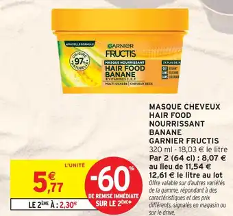 En plus de l'offre Garnier fructis masque cheveux hair food nourrissant banane, Intermarché propose une large gamme de produits. Consultez le Catalogue Intermarché Drive hebdomadaire pour découvrir les meilleures offres et promotions. En plus de Garnier fructis masque cheveux hair food nourrissant banane, il y a aussi : MASQUE CHEVEUX HAIR FOOD NOURRISSANT BANANE GARNIER FRUCTIS, Garnier Fructis Masque nourrissant hair foof nourrissant banane & Masque hair food fructis de garnier.
