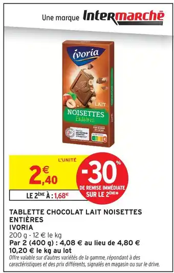Actuellement en offre chez Intermarché : Ivoria tablette chocolat lait noisettes entières ✅ Valable du 27-01 au 8-02.