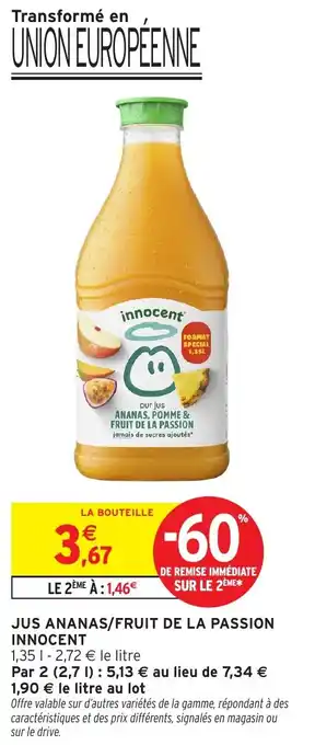 Actuellement en offre chez Intermarché : Jus ananas fruit de la passion innocent ✅ Valable du 23-12 au 31-12.