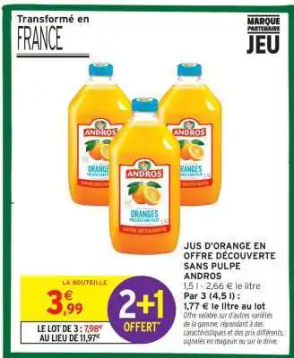 Actuellement en offre chez Intermarché : Jus d'orange en offre découverte sans pulpe Andros ✅ Valable du 13-01 au 25-01.