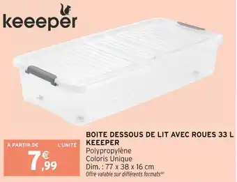 Actuellement en offre chez Intermarché : Keeeper boîte dessous de lit avec roues 33 l ✅ Valable du 30-12 au 11-01.