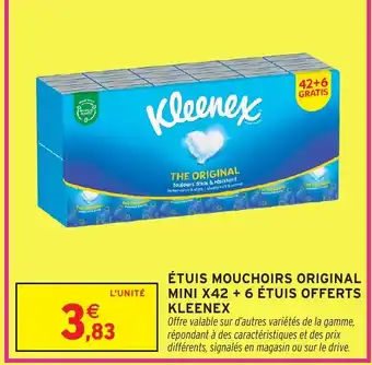 Actuellement en offre chez Intermarché : KLEENEX Étuis mouchoirs original mini x42 + 6 étuis offerts ✅ Valable du 30-12 au 11-01.
