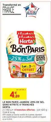 Actuellement en offre chez Intermarché : LE BON PARIS JAMBON -25% DE SEL SANS NITRITE 4 TRANCHES HERTA ✅ Valable du 10-02 au 22-02.