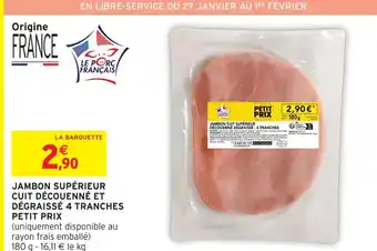 Actuellement en offre chez Intermarché : Le porc français jambon supérieur cuit découenné et dégraissé 4 tranches ✅ Valable du 27-01 au 8-02.