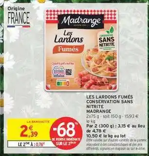 Actuellement en offre chez Intermarché : LES LARDONS FUMÉS CONSERVATION SANS NITRITE MADRANGE ✅ Valable du 28-04 au 10-05.
