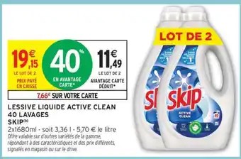 En plus de l'offre Lessive Liquide Active Clean 40 Lavages, Intermarché propose une large gamme de produits. Consultez le Catalogue Intermarché hebdomadaire pour découvrir les meilleures offres et promotions. En plus de Lessive Liquide Active Clean 40 Lavages, il y a aussi : Lessive capsule active clean skip, SKIP Lessive capsules 3-en-1 active clean & LESSIVE LIQUIDE TOTAL 40 LAVAGES 4 EN 1 XTRA.