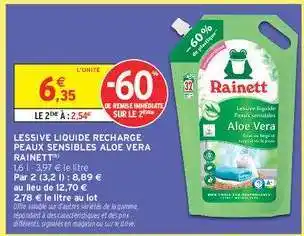 Actuellement en offre chez Intermarché : LESSIVE LIQUIDE RECHARGE PEAUX SENSIBLES ALOE VERA RAINETT ✅ Valable du 6-01 au 18-01.