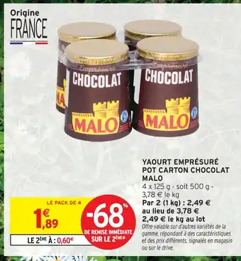 Actuellement en offre chez Intermarché : Malo yaourt emprésuré pot carton chocolat ✅ Valable du 3-02 au 15-02.