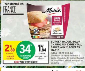 Actuellement en offre chez Intermarché : Marie burger bacon, bœuf charolais, emmental, sauce aux 2 poivres ✅ Valable du 28-04 au 10-05.