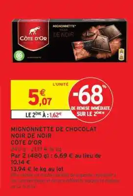 En plus de l'offre Mignonnette de Chocolat Noir de Noir, Intermarché propose une large gamme de produits. Consultez le Catalogue Intermarché hebdomadaire pour découvrir les meilleures offres et promotions. En plus de Mignonnette de Chocolat Noir de Noir, il y a aussi : Côte d'Or Mignonnette de Chocolat Noir de Noir, Chocolat noir & Chocolat noir dessert.