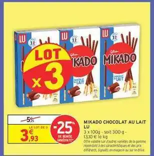 En plus de l'offre Mikado Chocolat Au Lait Lu, Intermarché propose une large gamme de produits. Consultez le Catalogue Intermarché hebdomadaire pour découvrir les meilleures offres et promotions. En plus de Mikado Chocolat Au Lait Lu, il y a aussi : LU Mikado chocolat au lait, MIKADO chocolat au lait & LU Petit écolier nappé au chocolat au lait.