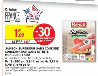Actuellement en offre chez Intermarché : Monique ranou jambon supérieur sans couenne conservation sans nitrite ✅ Valable du 17-02 au 1-03.