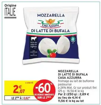 Actuellement en offre chez Intermarché : MOZZARELLA DI LATTE DI BUFALA CASA AZZURRA ✅ Valable du 8-04 au 19-04.