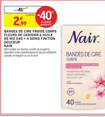 Actuellement en offre chez Intermarché : Nair bandes de cire froide corps fleurs de cerisier & huile de riz x40 + 4 soins finition douceur ✅ Valable du 8-04 au 19-04.