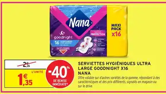 Offre NANA Serviettes hygiéniques ultra large goodnight x16 chez Intermarché