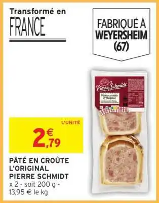 Actuellement en offre chez Intermarché : PÂTÉ EN CROÛTE L'ORIGINAL PIERRE SCHMIDT ✅ Valable du 27-01 au 1-02.