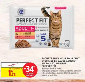 Actuellement en offre chez Intermarché : Perfect fit sachets fraîcheur pour chat stérilisé en sauce adult 1+ au poulet, au boeuf ✅ Valable du 24-02 au 8-03.