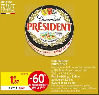 Actuellement, Président camembert est en promotion chez Intermarché. Toutes les informations utiles comme le prix, les conditions et la durée de validité sont affichées sur cette page. Consultez également les promotions similaires pour Président camembert, afin de faire le meilleur choix. La promo Président camembert est valable du 16-12-2025 au 28-12-2025. Si elle est expirée, regardez les autres offres équivalentes. Vous pouvez aussi suivre cette catégorie de produit pour être alerté lorsqu’une nouvelle promotion Président camembert apparaît chez Intermarché.Questions fréquemment posées au sujet de Président camembert
